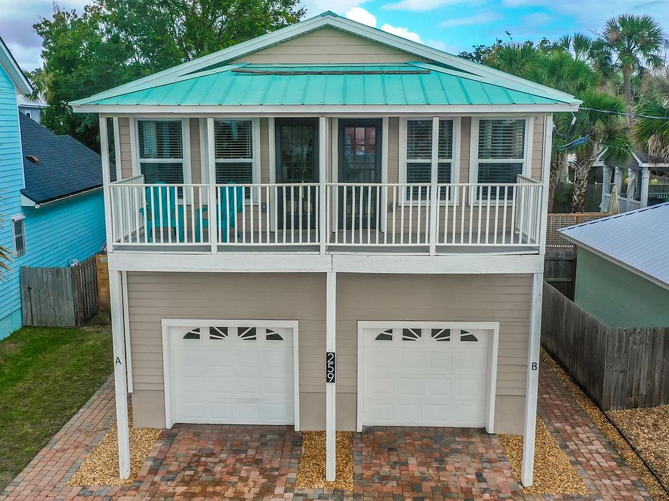 Fantastic investment opportunity in the Historic Lincolnville District! This side-by-side duplex offers flexibility—rent out both units, or live in one and lease the other. Each two-story unit features an identical layout, with 1 bedroom and 1 bath on each floor. The downstairs level includes a bedroom, bath, washer/dryer, durable vinyl flooring and a private entrance to the backyard. Upstairs, you'll find a spacious bedroom and bath, a kitchen with granite countertops, stainless steel appliances, stainless steel large single basin sink, large kitchen island with bar seating, a large living room, vaulted ceilings, oak wood floors and a balcony overlooking Riberia Street. Each unit also has its own pavered walkway to a private entrance, pavered driveway parking space, a 1-car garage and a gated entry to the backyard. This property is loaded with charm and modern touches, including a painted metal roof, designer tile in the kitchens and baths, LED light fixtures, cordless blinds and fresh paint. Recent updates include refinished oak floors upstairs, new horizontal front fencing with two gates, new back doors, new interior and exterior door knobs and freshly painted trim in the stairwells. Each garage is 11.5 feet high with storage above the bay. With long-term rental potential estimated at $2,300–$2,700 per unit and projected short-term rental revenue around $100,000 annually (per AirDNA), this property is a prime income-generating asset. Zoned RG-1 with no rental restrictions, it qualifies for nightly rentals per City of St. Augustine zoning regulations. Great location close to Ice Plant, St. Augustine Distillery, St. Augustine Fish Camp, San Sebastian Winery and Eddie Vickers park that includes a public swimming pool! Don’t miss out on this versatile and profitable property!