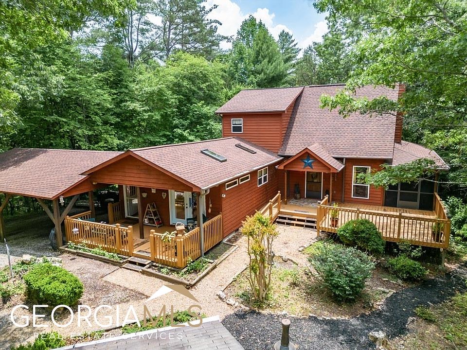 Enjoy private living both inside & outside this cabin-style home on a cul de sac. With a BR on ea level of the home, each floor offers its own extras. Main floor has a huge LR w/ stacked stone FP (gas), vaulted ceiling, & screened deck access; paneled DR; huge kitchen w/ added cabinets, granite c-tops, S/S apps (5 burner gas range, microwave/convection oven, wine fridge), farmhouse sink, & skylight; laundry/mud room w/ sink; sunroom w/ hot tub & skylight. Upstairs includes loft area & BR w/ en suite & walk-in closet. Terrace level includes LR/game room w/ gas stove & loads of storage, BR, & a partially-stubbed BA. Plenty of spots gathering spots including rocking chair front porch, wraparound screened deck, back patio, a side deck, & fire pit area. Spacious 2-car carport, 2 utility sheds, newer roof (2021), new a/c (2022). Great investment property! Furnished via SBOS minus personal items.