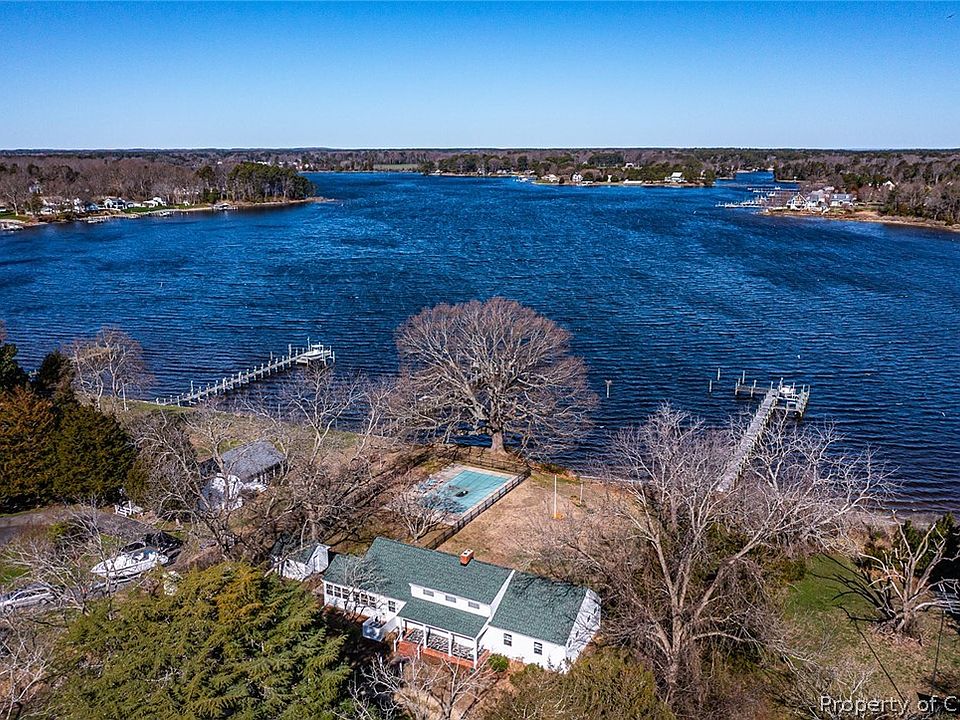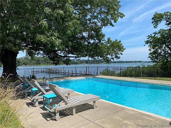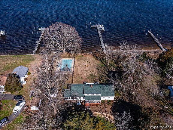 This 2.52 acre waterfront property is ideal for anyone looking to find a peaceful getaway on the river. Includes a covered masonry front porch, wooden back deck, 21'x41' Gunnite inground pool with low voltage landscape lighting and 6'x180' private pier. Private pier features include boat lift with finger pier, 10'x20' L Head and 3 outboard pilings for larger vessels to moor. The built in fish cleaning station has running water access and a spotlight. Sits on a sandy bottom with 5' water depth at the L head during low tide and partial riprap with sandy strip hugging the shoreline. The spacious 1,692sq' single story home features 3 bedrooms, 2 full baths, an additional 572sq' of unfinished basement and large open attic with lots of storage space. Furnishings and window treatments are included with the home as well as the following appliances: Side by side Washer & Dryer, Dishwasher, Samsung Range/Oven with Convection setting, Samsung microwave with intergral range venting and LG Stainless Steel Refrigerator with upper freezer compartment. The outdoor shed, located within the fenced pool area, has subpanel with power and an included refridgerator unit, yet still offers plenty of space for storage. The 28'x28' unfinished, 2 car, detatched garage is a newer improvement added to the propery and also has ample space for storing both yard & boating equipment. The garage sits away from the main house near the entrance of the circle drive giving room to maneuver larger crafts and vehicles easily.
