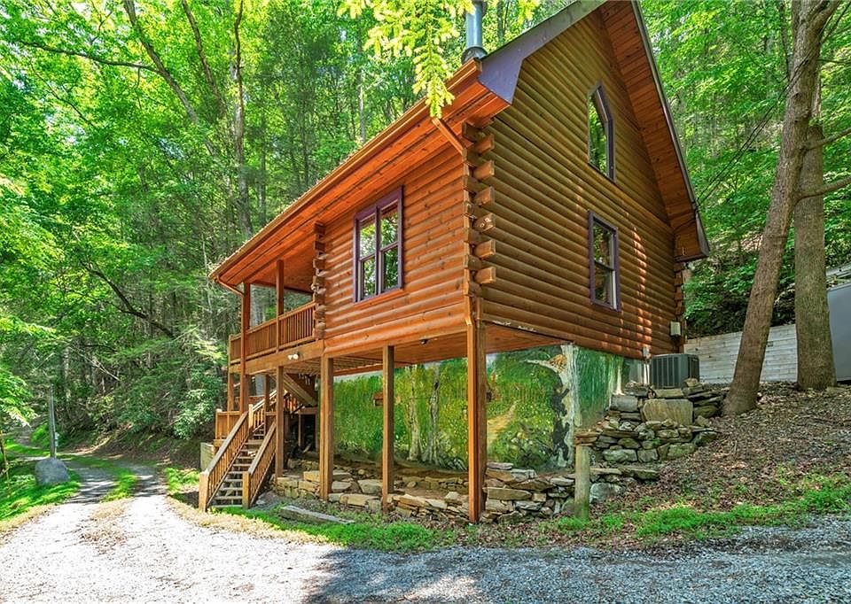 This Serene Mountain Getaway is the perfect place to relax! Soak in nature amongst the mature trees, babbling river, and mountain views. This riverfront log cabin features a uniquely painted mural, driveway parking and a staircase down to the water's edge. Quaint one level living includes master suite on main, open concept kitchen and living room + laundry on main. Spacious loft is great space to use as an additional bedroom option, home office, or bonus space. Enjoy the natural light that pours in all day through the windows. Stained wood walls/ceiling and floors give a warm homey feeling the minute you open the door. Snuggle up by the 2 story rock fireplace for a good book or cup of coffee. Or enjoy a dinner outside on the spacious deck. Endless potential in this property!