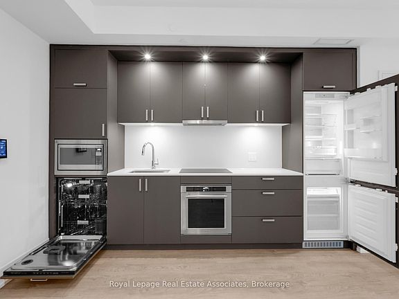 Welcome to Edenbridge at The Kingsway, a brand-new residence offering timeless design and luxury amenities. This 1-bedroom, 1-bathroom suite spans 597 sq. ft. of thoughtfully designed living space. The open-concept layout features wide plank flooring, a modern kitchen with built-in stainless steel appliances, sleek cabinetry, and quartz countertops, and a bright living and dining area with large windows that fill the space with natural light. The spacious primary bedroom includes a walk-in closet with custom shelving, while the spa-inspired bathroom showcases porcelain tiling, a glass-enclosed tub/shower combo, and a modern vanity. In-suite laundry is included for everyday convenience. Residents enjoy an unmatched lifestyle with indoor amenities including Bar and Lounge Area, Swimming Pool, Whirlpool, Sauna, Fitness Centre, Yoga Studio, Guest Suites, Party Room, and Dining Room with Terrace. Outdoor amenities feature a beautifully landscaped Private Terrace, English Garden Courtyard, Rooftop Dining/BBQ Areas, and the convenience of 24-hour Concierge Service. Perfectly situated at Royal York and The Kingsway, the community is steps to Humbertown Shopping Centre, top schools, parks, transit, and only minutes from downtown Toronto and Pearson Airport.