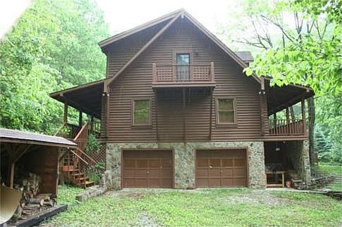 Lodge style CREEK FRONT 3BR/2BA log cabin 2 car garage, covered/open decks/porches, Open Living/kitchen/formal dining room. Two roomy bedrooms downstairs and 1 bath, spacious closets. Large MBR upstairs with private bath and sitting area off from MBR overlooking living area. Rock fireplace, hdw floors, custom cabinets, granite counter tops, etc. Large Barn, pasture land and borders USFS