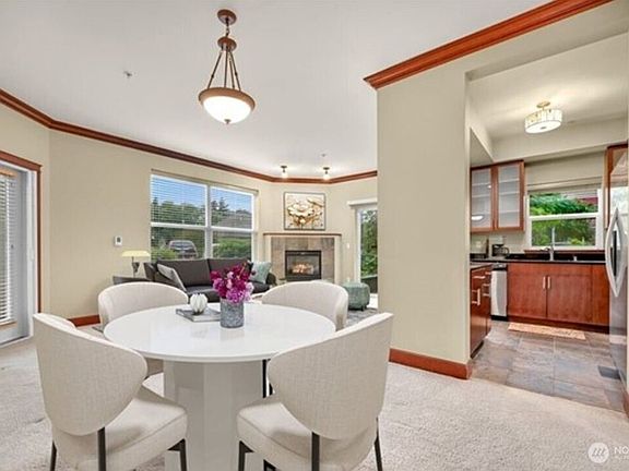 This stylish ground floor end-unit condo features 2 bedrooms and 2 bathrooms in a bright, open concept design. Enjoy a cozy gas fireplace in the living room, which flows seamlessly into the kitchen and dining area. This unit is unique, offering not one but two private patios—one off the living room and another from the primary suite—for your own outdoor escape. The primary bedroom includes an en suite bathroom with a double vanity. Building amenities include a secure lobby, underground parking, a fitness room, and a clubhouse. Conveniently located just minutes from Bellis Fair Mall, WCC, shops, dining, the Food Co-op, and WTA bus stops. No rental cap, making this an ideal opportunity for investors.