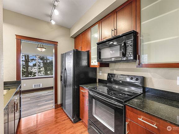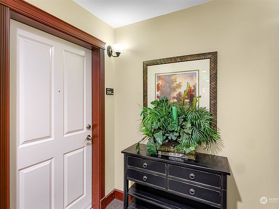Second-floor corner unit with a large patio & deck off the living room that overlooks a trail & greenspace. New carpet, floors & paint. Lrg Primary bedroom w/walk-in closet 5 piece bath & shower, and connected deck. Plenty of storage. Granite kitchen opens to the living room & dining rooms. Gas fireplace (condo association pays for gas) in the comfortable living room with views of greenbelt trees. One full & 3/4 bath, both w/slate floors, stone countertops & wood cabinets. A private second bedroom can be used as an office. Elevator to the parking garage, assigned space & storage. Private clubhouse & gym for residents. Meridian Retail District, close to Whatcom College, restaurants, bus stop & 1-5. Hospital services are close by.