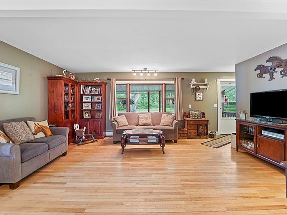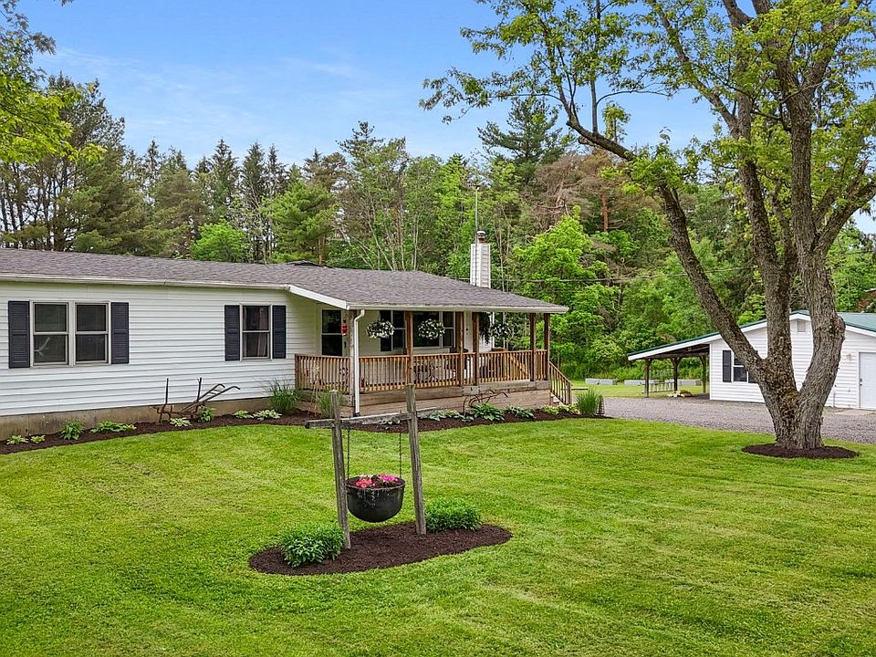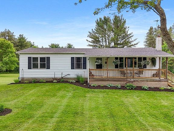 Nestled on nearly 4 acres of scenic land, this 3-bedroom, 2-bathroom ranch-style home offers a peaceful country setting just minutes from Dryden and Ithaca. Built in 1973, the home features 1,488 sq ft of comfortable living space, ideal for those seeking privacy and room to grow. Features include open-concept floor plan with a large living room and dining area, perfect for entertaining or relaxing with family. The kitchen is equipped with ample cabinetry and counter space. Three generously sized bedrooms provide comfortable retreats. Bonus room provides a beautiful view of the massive manicured almost 4 acres, great for gardening, relaxing and hosting social events. The 62'x46" out building, with electric, is perfect for RV storage or equestrian riding. A two-car garage provides storage, parking and also a workshop. House is set up for being a small kennel with dog runs and washing room in the basement. Convenient to Ithaca and Cortland. Ask to see attachment for upgrades