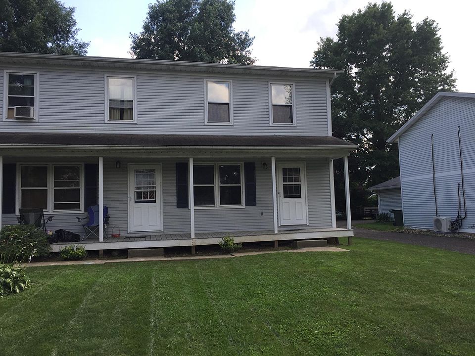 Left side of duplex/ living and half bath first floor / 3 bedrooms full bath 2nd floor / back patio / garage / nice quiet neighborhood / basement laundry hook up. Stove and refrigerator furnished. 1 year lease then reverts to month to month Tenant responsible for trash and electric Landlord pays county sewer No pets No section 8