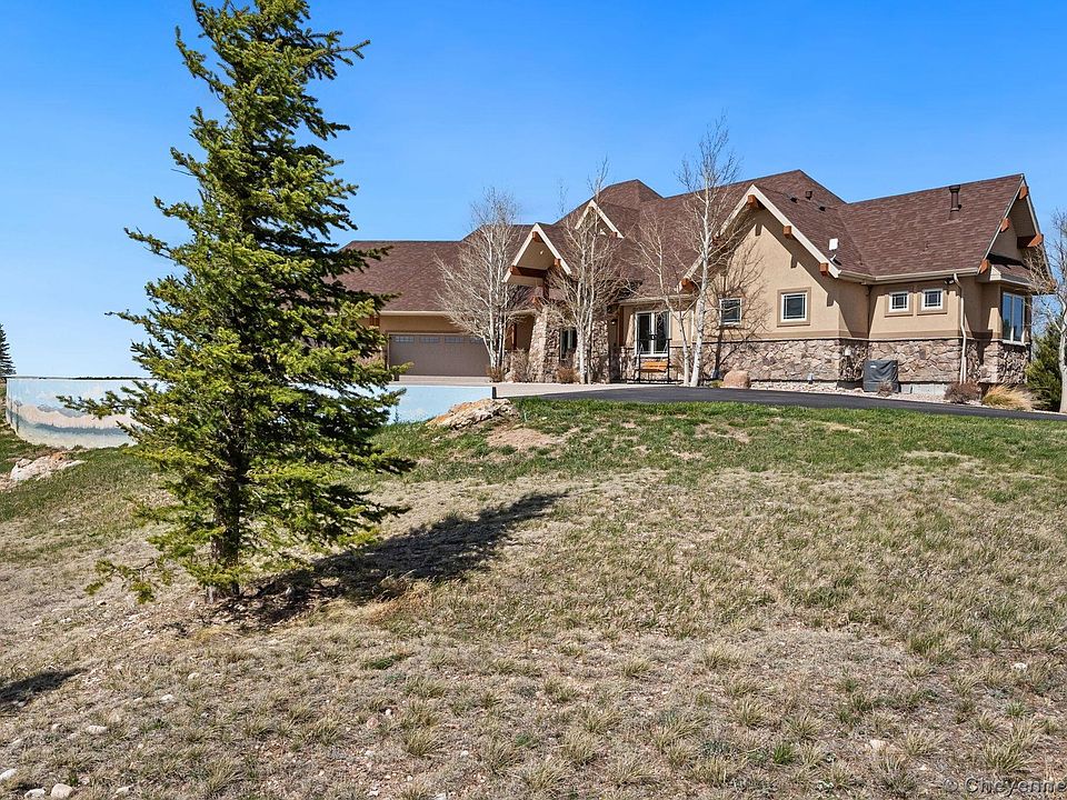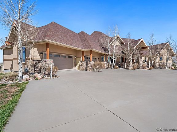 Escape to your own private retreat on 11 acres, where the beauty of nature meets the convenience of modern living! This stunning stucco home offers the perfect blend of elegance and functionality, with amazing views and only a few minutes from Cheyenne. Step inside to discover 5 spacious bedrooms and 6 bathrooms, providing ample space for everyone. Additional features include a breakfast area, office, and a basement kitchen. With two primary bedrooms featuring luxurious bathrooms, you'll enjoy ultimate comfort and privacy. Indulge your senses in the home theater or unwind in the sauna and melt away the stresses of the day. Car enthusiasts will appreciate the 4-car heated garage with epoxy floors, providing a pristine space for vehicles and storage. Additionally, the property boasts two sets of laundry hookups for added convenience. Relax and entertain in style on the large patio or in the enclosed sunroom, where you can soak in the panoramic views of the surrounding landscape. For those with hobbies, the 40x64 heated shop with a lean-to offers endless possibilities. Fully insulated with spray foam, this versatile space is ready to accommodate any project you can dream up. Don't miss your chance to experience the ultimate in country living!