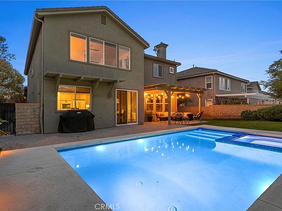 This 5+3+3 Stevenson Ranch Pool Home is the Epitome of Elegance and Luxury, Boasting nearly 3,200 SQFT of Open Living, Bed and Bath Downstairs, EV charging, and Low HOA this home really has it all. The interior highlights include soaring high ceilings, tons of natural lighting, grand dual staircase, whole house and attic fan, ceiling fans, dual HVAC, recessed lighting, in-law floor plan, newer interior paint, and modern fixtures throughout. The warm and inviting formal living room features a custom stone fireplace, while the grand formal dining room is perfect for family dinners. Outdoor breezeway that is ideal for a book and your morning coffee, or a separate play area for the kiddos or four legged friends. The spacious family room highlights a custom modern fireplace with wood mantel and wood floating shelves. The family room also opens to the large eat-in center island kitchen, which features upgraded appliances, a walk-in pantry, wine refrigerator, dual ovens, and serene views of the yard and hills. Downstairs, you'll also find a double door entry room that can easily be converted to a 5th bedroom, and a remodeled bathroom with a glass-enclosed walk-in shower. The grand staircase leads you to the stunning primary suite with a sitting area, gorgeous views of the hills, and an ensuite bathroom that features dual vanities, dual walk-in closets, a modern freestanding tub, and a beautiful glass-enclosed walk-in shower. There are also three secondary bedrooms, a full bathroom with dual sinks, and a conveniently located laundry room with utility sink and storage. Stepping outside, you'll find no rear neighbors, a spectacular in-ground pool and spa, luxurious landscaping, a removable child safety pool fence, new pool filter pump, and newer paver decking. The pergola-style covered patio and side yard with pavers are perfect for outdoor entertaining. This home is located near award-winning schools, easy freeway access, parks, shopping centers, restaurants and more! Don't miss your chance to make this your next home!