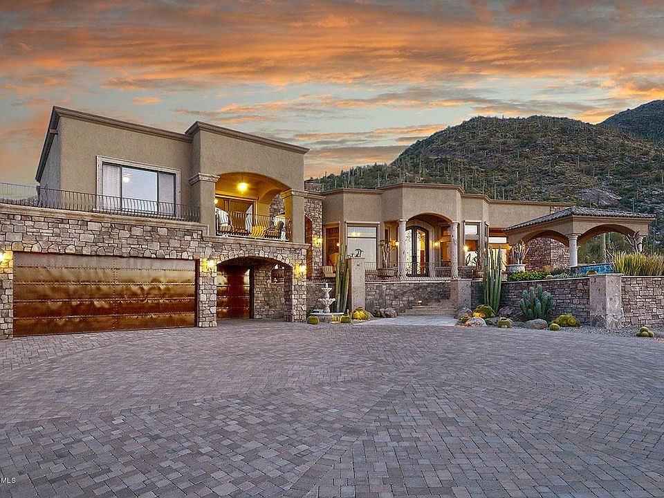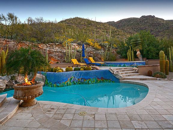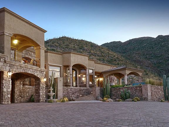 For more information on this property, contact the Listing Agent, Janell Jellison at (520) 918-5469 or JanellJ@Mindspring.com. Beautiful Tuscan Villa high above the city with stunning vistas.. Front cantera patio with spa and fountain. Walk inside thru high iron and glass doors to formal living and dining rooms, luxurious master suite includes den, exercise, and huge master closet. Gourmet kitchen with granite counters, newer cabinets, newer appliances, island and breakfast nook with windows and mountain views, family room with fireplace, game room, and guest suite. Very private backyard with pool, spa, covered outdoor kitchen and views of the lush Sonoran dessert and the canyon.