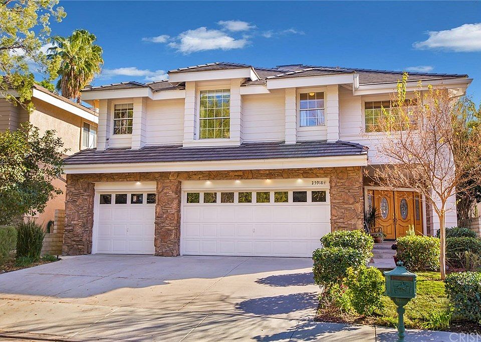 VIEWS! This stunning Stevenson Ranch pool home with a view featuring 4 bdrm, 3 bthrms & 3,366 Sq. Ft. of living space is the home you will not want to leave! This home offers an open concept floorplan. Upon entering the home through double doors, you'll notice the soaring ceilings, marble flooring & windows galore w/ mountain views. The step down living room showcases 1 of 3 fireplaces & newer porcelain wood-like flooring. Entertainer's kitchen w/ refinished cabinetry, Corian counters, large island w/ gas cook-top, recessed lighting, dining area & lots of windows to enjoy family meals & the beautiful views! Family rm w/ fplc. Conveniently located downstairs is an office & ¾ bthrm & direct access to the 3 Car garage. Head upstairs to the spacious master suite w/ high ceilings, retreat w/ fplc & more views! Step outside onto your private balcony to enjoy a glass of wine, a good book & the beautiful sunsets. The master en-suite has a walk-in shower, separate tub & walk-in closet. The secondary bedrooms are great size. The upstairs hall bthrm features dual sinks, porcelain tile flooring & a shower/tub combo. Also located upstairs is the laundry room. A few more upgrades are dual A/C, paid solar, whole house fan and owned water-softener system. Backyard w/ private pool/spa & Flagstone pavers w/ no front or rear neighbors! Located close to the Pico Cyn stairs, parks, Award-winning schools, restaurants, shopping & the 5 fwy. This is the dream home you have been waiting for!