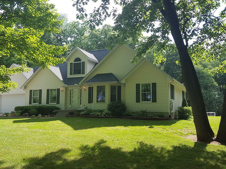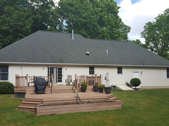 Beautiful 4-5 bed residence on 6 wooded acre lot. IDA Schools. City water. Separate 2 acre improved, buildable lot included in price (8 acres total). Home is finished with oak crown molding & six panel doors. Kitchen with peninsula, quartz countertop, oak cabinets and travertine tile backsplash. Anderson windows & French doors lead to an expansive, two tier, maintenance-free Trex deck. Finished basement with pellet stove, mechanical room, laundry, office/bedroom & Bilco door. Plenty of storage including two large, separate attic storage areas. 24 X 40 stick built separate garage has concrete floor, generator hookup, 220 service & second floor storage.