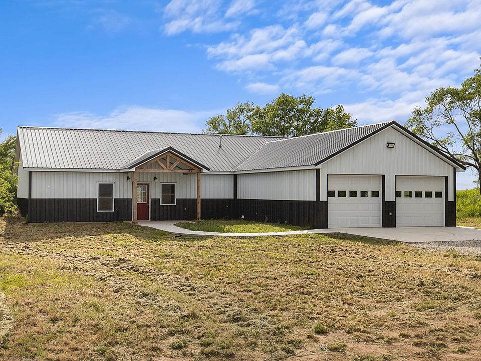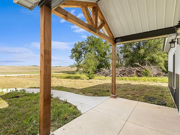 Spacious new construction on land! 2,126 square foot, 3-bed, 2-bath home constructed by Yoder Engineered Structures, just 2 miles east of Kingman. Situated on 5.5 acres with mature trees. The home was constructed with 100% Class 4 impact resistant metal siding and roof. Inside you will love the open living concept and vaulted ceiling, custom Amish made knotty hickory cabinets and trim throughout. Includes stainless appliances, waterproof hickory vinyl plank flooring in main living space, carpeted bedrooms and ceramic tile in the bathrooms. Master bath features walk-in Onyx shower, deep soaker tub, double sink vanity, water closet and walk-in closet. Oversized 650 square foot garage with epoxy painted floor, 10’x8’ garage doors, dedicated outlet for freezer and finished attic space for storage. Massive covered back patio area with hot tub disconnect installed. New water well, leased propane tank and new septic system. HVAC features gas and electric heat option for backup. New driveway with 3” rock base and gravel surface. This home was enrolled in the Kingman County Kansas Revitalization Program before being built and the new owner will benefit from property tax refunds as follows for the first 5 years of ownership: year 1 – 70%, year 2 – 50%, year 3 – 30%, year 4 – 20%, year 5 – 10%.