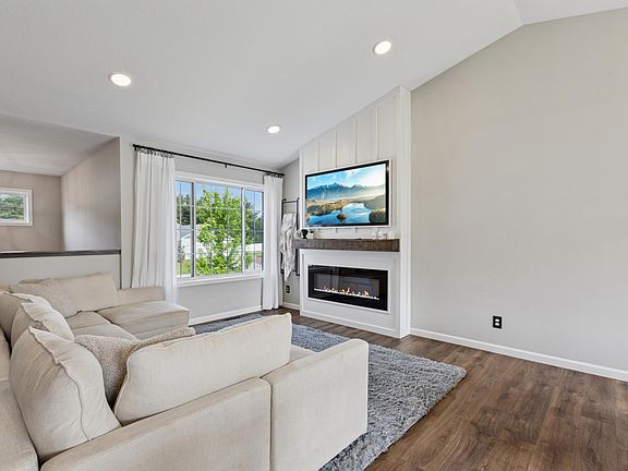 Kitchen features large island, stainless appliances, and quartz countertops. Sun-drenched vaulted ceilings is warm and inviting with