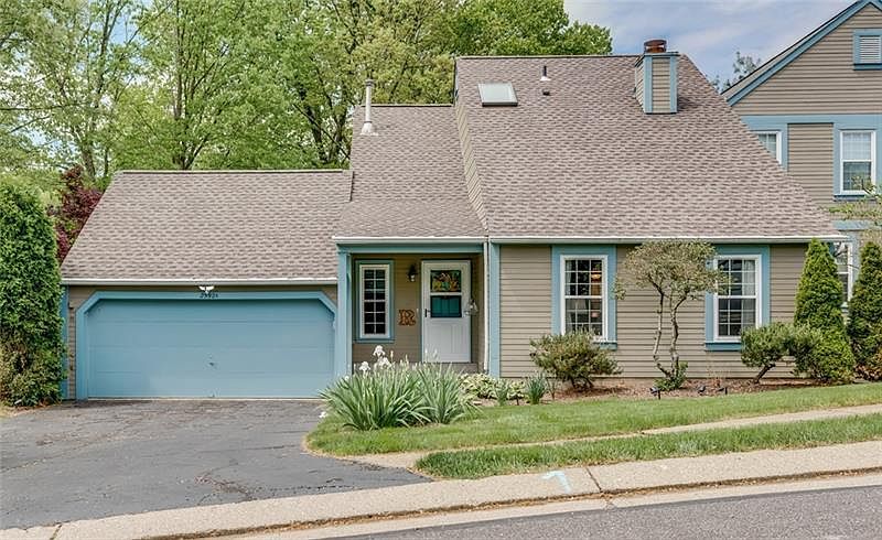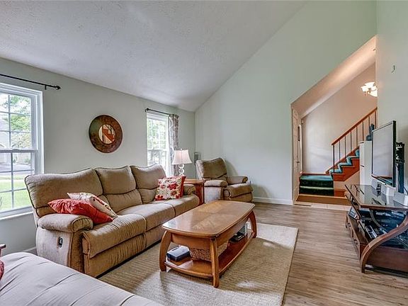 PRIVATE & TREED. Enjoy your END unit with extra outdoor space treed rear yard all from your deck which accesses the kitchen & dining room. Cathedral ceiling and fireplace add luxury the GR. NEW neutral long lasting flooring throughout the first floor in dining, living, kitchen and, foyer. Freshly painted in warm neutral colors. NEW ROOF. 2 car garage not common in this plan. 2nd floor holds both bedrooms with lighted closets. A walk-in closet and 2nd floor security light for the rear yard in the master bedroom. Both full bathrooms updated with a NEW SKYLIGHT lending loads of natural light. STORAGE ABOUNDS in this unit, space above the garage as well as plenty of space and BUILT_IN SHELVING in 2 car garage and basement. New owners will enjoy all amenities including pool, tennis courts, clubhouse and, playground. NEW MECHANICS. NOTHING TO DO BUT MOVE IN.