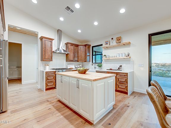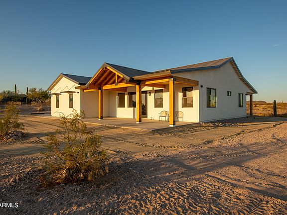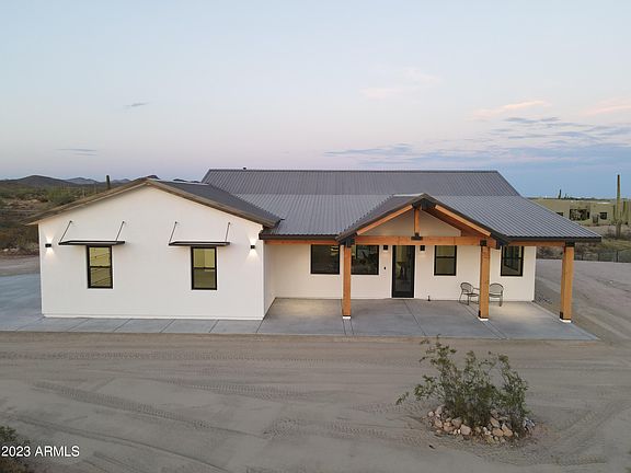 Brand new 2023 custom home available NOW! Enjoy country living in this energy efficient and meticulously crafted home on 1.9 acres just outside of Wickenburg. This home offers features and upgrades that are hard to find in new construction. Country living at its finest with 3 bedrooms, 2 full bathrooms, 3+ car garage, a 1,965sf open floorplan and horse property to boot! Your gourmet kitchen boasts stainless steel appliances (inc. 6 burner cooktop), solid wood cabinets, oversized island, farm sink and waterfall quartz countertops. The front living area features a custom steel surround on the 48'' Empire gas fireplace, vaulted ceilings and natural lighting for a comfortable, relaxed atmosphere. Spacious master bedroom with slider to rear patio adjoins the bathroom that features his/her vanities, separate shower and Kohler soak tub, sandstone flooring and marble shower coupled with quartz countertops. The second and third bedrooms feature oversize rooms and mirrored closets with built ins. The hallway second bathroom features marble wall enclosure shower/tub and sandstone flooring. Extensive use of tongue and groove natural wood throughout interior hallways and exterior patio and porch areas. Fable Oak wire-brushed engineered hardwood on all interior floors except bathrooms, SW paint interior and outside, recessed ceiling LED lighting, ceiling fans in each room, wired throughout for speakers and security and so much more inside to offer! Extended 3+ car garage with 25' depth and 10' ceilings can fit all your trucks, cars, boats, etc. Enjoy sunsets from your extended front porch or sunrises from the back patio with outside features including full RV hookups, 400amp panel, extended slab parking, brand new high flow well and septic system, pole and wire fencing surrounding entire property with 2 access gates and custom crafted metal overhangs on all windows. Energy efficiency design throughout including Bunger steel metal 50 year roofing and Boral Tile Seal underlayment for durability, Anderson Fibrex windows and DuPont flashing tape, Tyvek HomeWrap, Trane high SEER heat pump HVAC coupled with Fantech's HRV clean air system keeps your home at the right temp and continuous fresh air, full spray foam insulation in the entire attic/crawl space are just a few of the efficiency features. This country home has room for so many options including pool, guest house, workshop, RV garage, mare motel, horses/cattle & SO MUCH MORE! Come fall in love today!