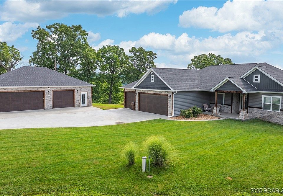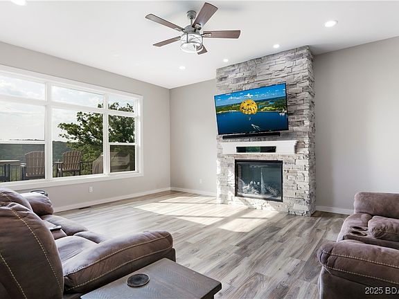 CUSTOM CONSTRUCTION, ACREAGE, PRIVATE RIVER ACCESS - This gorgeous custom home sits on a hilltop on 23 acres overlooking the Niangua River Valley, enjoying captivating sunrises. Accommodate EVERYONE and EVERYTHING with over 4000sf, large oversized 3 car garage and Incredible 30X40 climate controlled 3car+ detached shop. The home features massive windows showcasing spectacular views, an open layout, soaring ceilings allowing tons of natural light, 2 beautiful stone-faced fireplaces, Luxury Plank flooring, Whole House Generator and Tankless Water Heater. The main level includes a large chef's kitchen with custom cabinetry, quartz counters, stainless appliances, and an enormous butcher block island. Also, a spacious master suite with private bath w/ dual vanity, large walk-in closet and beautifully tiled walk-in shower, and two guest bedrooms, full bath and laundry. The lower level with stamped concrete radiant heated floors offers a HUGE family room, two bedrooms (one with private bath) and two bonus rooms that could be a media room, exercise, office, non-conforming sleeping, etc.. A private gated road leads to subdivision access to the river. See Features Sheet for more details
