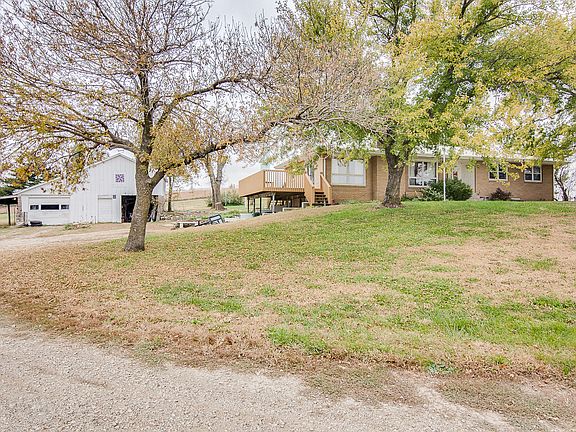 THIS PROPERTY WON'T LAST LONG! Beautiful views of the flint hills available with this 3 bedroom 1.5 bath ranch with unfinished basement on 5.6 acres! Spacious living area includes beautiful native stone fireplace and leads to over-sized composite wood deck. Kitchen has Custom Wood cabinetry, tiled back splash and newer appliances. Bedrooms include hard wood floors! Main bath has dual onyx vanities with walk in shower! Large storage shed with carport included.