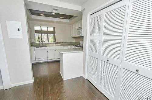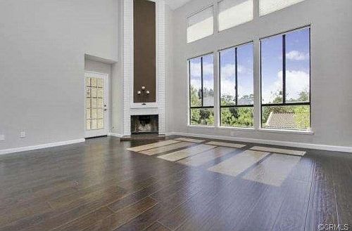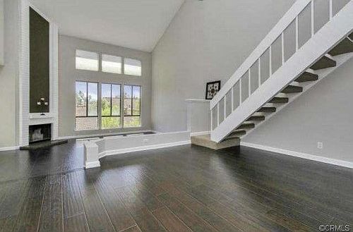 Stunning upper level modern condo with conveniences of a large home! Located in the central gated community near the Mission Viejo country club, this home boasts new plank dark wood flooring, upgraded carpets, slab granite counters, tall baseboards, designer two tone paint, super high volume ceilings, views, large rooms, crown moldings and an impressive fireplace! This small community is located near schools, shopping, entertainment and has easy access to freeway. Lake Mission Viejo privileges.