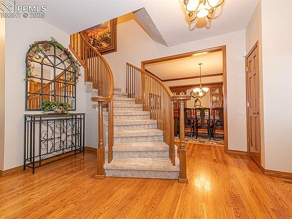 Nestled on 1.8 private acres in the heart of town, this extraordinary residence offers a rare blend of luxury, privacy, and development potential. Tucked away in a serene setting that backs directly to the prestigious Colorado Springs Country Club, this one-of-a-kind property feels like a secluded estate while being only minutes from everything. The expansive lot is already subdivided into three legal parcels, offering an unmatched opportunity for future development, multigenerational living, or simply enjoyment as your personal retreat. Spanning over 6,500 square feet, this meticulously crafted home showcases timeless elegance with stain-grade wood trim, cherry cabinetry, and custom finishes throughout. The chef’s kitchen is a true masterpiece, featuring Jenn-Air appliances, leathered stone counters, eat-in dining, a massive walk-in pantry, and butler pantry connecting the dining room. The open floor plan flows effortlessly into the living areas, ideal for entertaining and everyday living. Upstairs, the primary retreat offers a peaceful haven with granite surround fireplace, coffee bar, expansive walk-in closet, and spa-inspired five-piece bath complete with a jetted tub and oversized walk-in shower. A second spacious bedroom upstairs enjoys an en suite bath and Pikes Peak views, while a third bedroom is served by a full hall bath. The finished basement is an entertainer’s dream, featuring 9' ceilings, a striking antique bar with leaded glass and hand-carved details that remains with the home. Large living area with fireplace, a ¾ bath, and a generous guest retreat—currently used as a gym—offer versatility and comfort. Additional features of this incredible home include a large office, expansive covered patio, seven-car garage, meticulous grounds, dual-zone high-efficiency heating and air with humidifier, and an unmatched sense of craftsmanship and care. If you're looking for a private oasis, a place to entertain, or an investment—this exceptional estate delivers.