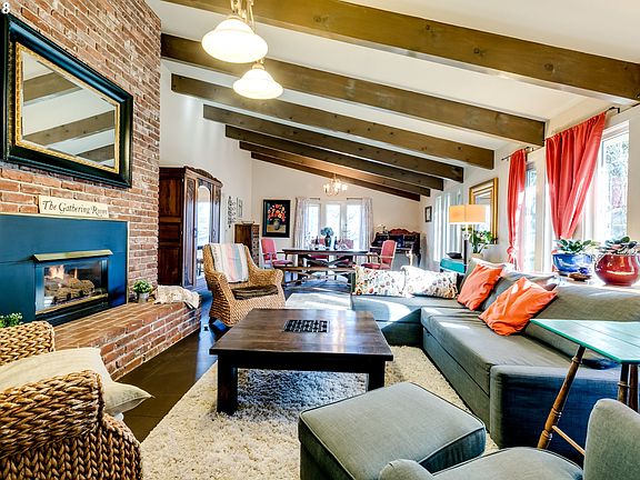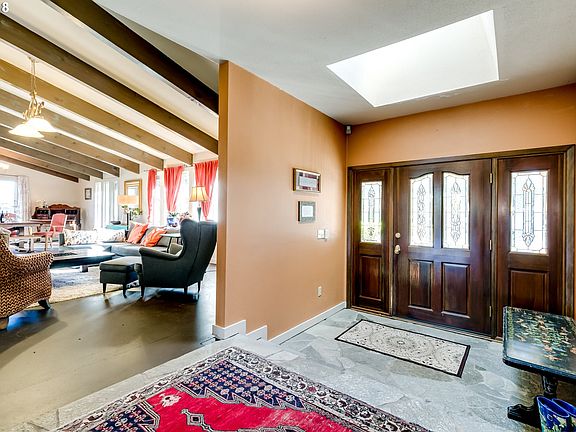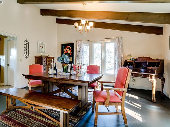 Beautiful home for large or extended family. The large, main level living room features a fireplace, vaulted beamed ceilings. Large, open, updated kitchen with stainless appliances, gas cook top, Italian granite counters and vaulted ceilings. Family rooms on both levels. Primary bedroom suite on the main level. Spacious rooms. Beautiful deck with views of the Coburg Hills.
