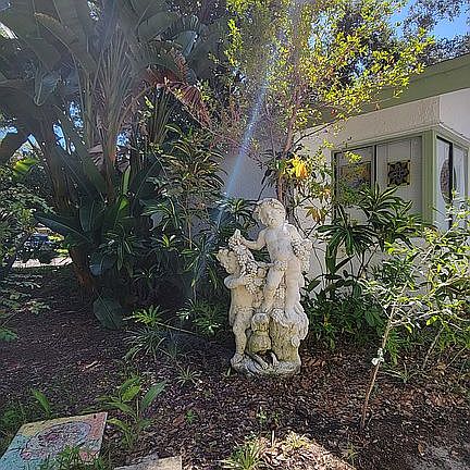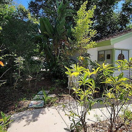 Beautiful, unique home on a double corner lot that has been lovingly molded into a botanical garden. This is perfectly suited "as-is" for someone that loves a bohemian style environment and a tropical surrounding. There is an amazing 800 square foot custom designed art/recreation room, indoor atrium with established foliage, motorized skylight, established outdoor gardens surrounding house and on extra lot, jacuzzi bathtub and much more. There is so much potential with this home with or without renovation. Keep or sell the adjoining lot. No agent inquiries. Owner will not list. Price is firm.