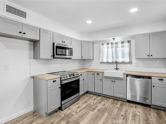The remodeled kitchen is a chef's dream, featuring new Grey shaker cabinets, farmhouse sink, butcher block counters, white subway tile backsplash, and stainless steel appliances. The open floor plan seamlessly connects the living and dining areas, both adorned with Recessed LED Lighting, leading to an attached roughly 10’ x 20’ Conditioned Sun Room with tile flooring and new ceiling fan that expands the living space by approximately 200 sqft.