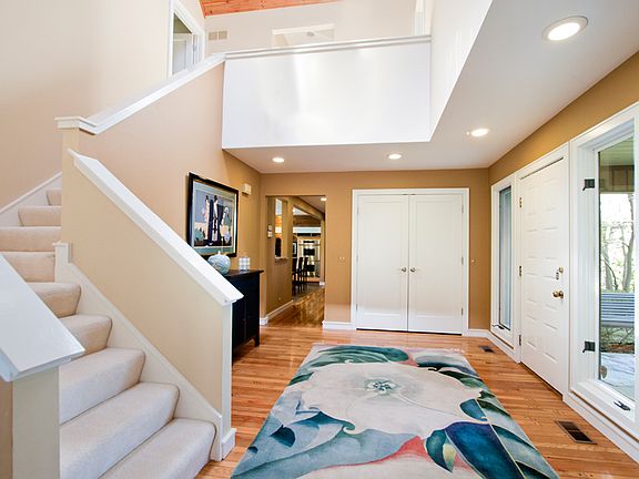 Beautifully designed contemporary with fabulous floor plan, this one of a kind home is open & bright with vaulted ceilings, skylights, & custom 2 story windows throughout. Updated kitchen made for entertaining features custom cabinets, granite, stainless appliance, large center island with breakfast bar. First floor master suite has dramatic volume ceilings & luxe master bath. Living room accented by stone fireplace, separate dining room, inviting family room that leads upstairs to a loft/flex space. 2nd floor has ensuite bedroom, generous room sizes plus large cedar storage closet. Finished lower level flooded with natural light & plenty of extra living space with rec room, wet bar, exercise area, sauna. Great outdoor living-screened porch leads to refinished deck & beautiful backyard. Many updates including newer kitchen & baths, roof (2019), paver porch, sump pump, & more. This modern home in serene natural setting won't disappoint - close to hiking trails, marina, and more!