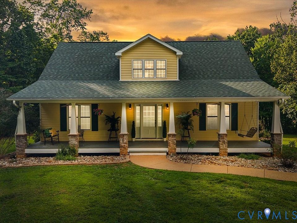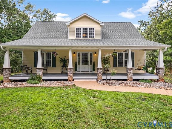 THE EPITOME OF SOUTHERN LIVING, FULL FRONT & FULL REAR PORCHES! Welcome to your private retreat. This charming CUSTOM-BUILT Cape Cod is nestled on SIX SERENE ACRES just a few miles off the Shannon Hill exit, offering both convenience & seclusion. Step into the two story foyer & be greeted by STUNNING RECLAIMED WOOD FLOORS that flow throughout the main level, adding warmth & character at every turn. The open floorpan is designed for both everyday living & entertaining, w/ a seamless connection between the kitchen, dining & living areas. The FIRST FLOOR PRIMARY BEDROOM features new carpet & paint, a large walk-in closet & spacious bath w/ jetted tub, tiled walk-in shower, upgraded vanity & heated floors. On the second floor, you'll find two sizable bedrooms, new carpet & paint & an updated full bath w/ a custom vanity & heated floors. The FINISHED WALK-OUT BASEMENT is a perfect space at 1,193 square feet & has an abundance of uses. The basement features large windows, recessed lights, full bath & is plumbed for a kitchenette (perfect in-law suite, teenager suite, office, rec room, man room, etc)! The basement leads to an oversized aggregate patio allowing additional for entertaining space. **Additional features include DUAL ZONED HVAC, deep well, WIRED FOR A GENERATOR (has separate generator panel), central vac, water softener & filtration system & conventional septic ). All this surrounded by mature trees & tucked away from street view, offering true privacy. 35 minutes to Short Pump, 20 minutes to Zion Crossroads!
