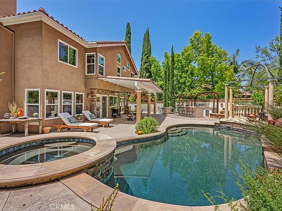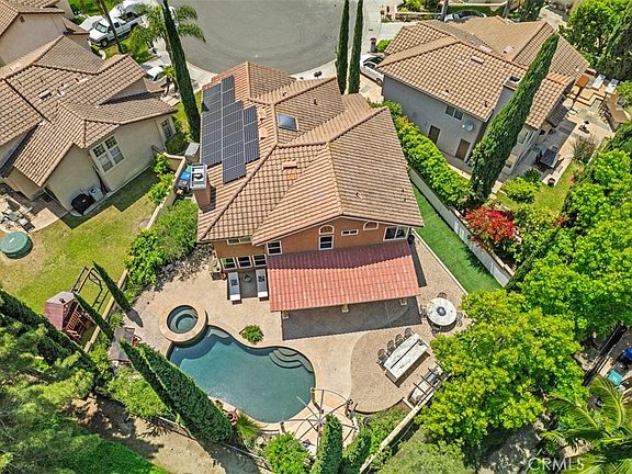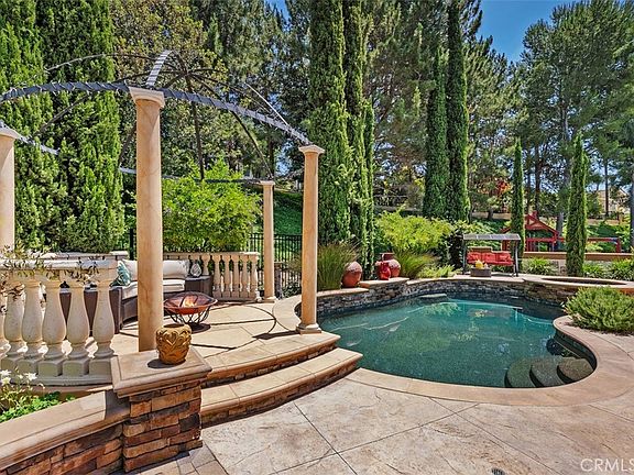 Rare opportunity! Fabulous pool home on an extra large and expansive pie shaped lot, situated at the end of a cul-de-sac in the highly sought after Califia development. This 2,539 sq ft, 5 bedroom, 2.5 bath home is an entertainers dream that offers something for everyone. Relax in your tropical oasis complete with salt water pool/spa, large built-in barbecue area also provides lots of counter space plus a bar height seating area. Enjoy dining al fresco under the massive fully covered veranda, lounge poolside in the sun or play a game of bocce ball on the spacious side yard. Entering the home, you are immediately drawn to the vaulted ceilings and open layout. Remodeled kitchen with top quality, custom cabinetry and stainless steel appliances is open to the breakfast nook and family room. Formal living room is adjacent to the dining room which also has french doors that open to the extra large covered veranda, adding to the wonderful entertaining options this home provides. Inside laundry room with dutch door, also opens to the side yard for added convenience and functionality. There is also a guest bath on the main level. Upstairs you will find a large primary bedroom with newly remodeled ensuite bathroom that includes new vanities, stand alone tub, large shower with frames glass surround and door, new flooring, toilet and more. Three additional secondary bedrooms are also located upstairs as is the oversized 5th bedroom that is currently being used as an office. The upstairs secondary bathroom is also newly remodeled throughout with new shower and enclosure, dual vanity, new flooring and more. This home doesn't stop there. It also has a whole house fan, solar that is owned, a dog run on one side and a coveted 3 car garage. Conveniently located close to shopping, restaurants, the mall, freeways, toll roads, beaches and the areas top rated schools.