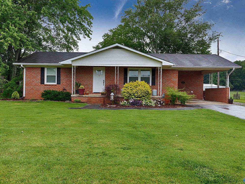 3 Bedroom / 2 Bath brick home with covered porch on +/- 1 acre! The interior of this home features LVP flooring and fireplace in the living room, LVP flooring and pantry in the eat in kitchen, master bedroom with LVP flooring and walk in closet, LVP flooring in both guest bedrooms and a separate laundry room with extra storage. Outdoor amenities include a covered front porch, one car attached carport with front entry, paved driveway, and a patio with firepit. This home is in a very convenient location to Hwy 72 and I-65.