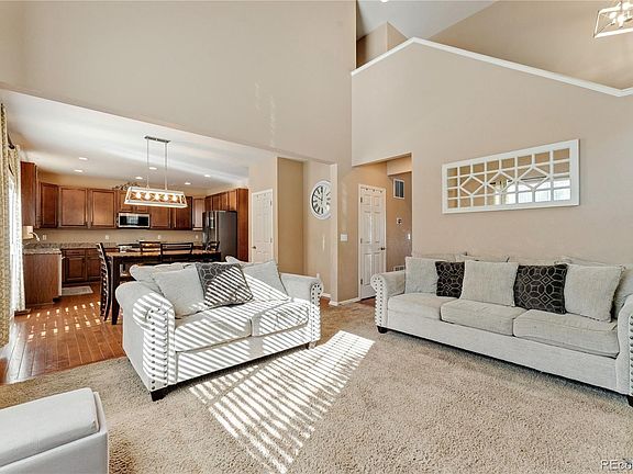 Discover this incredible opportunity to own this Craftsman-style home in Aurora’s prestigious community of Serenity Ridge! This lovely gem won an award as one of the best layouts in the 2010 Parade of Homes and has been a classic ever since. Enjoy being steps away from private neighborhood greenbelts to easily enjoy Colorado’s outdoors. Lovely mature trees and a charming covered front porch with an inviting red front door provides great curb appeal and a warm welcome to a great open layout waiting inside. Once inside, find plan a welcoming entrance to a formal living room that could also make a nice office. Head on to the back of the home to the spacious family room with cozy fireplace and soaring 2-story ceilings, The family room open directly to light & bright dining and kitchen making the space great for entertaining. The kitchen boasts sleek granite counters, stainless steel appliances with a desirable gas range, a plethora of warm wood cabinetry for all your kitchen essentials, and a center island for easy meal prep. Open the sliding door with lovely wood shutters to the private backyard to easily extend your indoor/outdoor living space. Three comfortable upstairs bedrooms, including the oversized primary with a large walk-in closet and 5-piece en-suite bath. An additional bedroom and bath found in the newly finished basement is prefect for guests’ privacy. The newly basement also features a 2nd family room that’s ideal for movie night entertaining or great play space. Gorgeous backyard ready for fall enjoyment. Relax after a long day in hot tub with new overhead pergola, expansive stamped concrete patio and lots of mature trees and greenery for added privacy. Located within walking distance to Cherry Creek Schools, shopping, Starbucks, and the community park with playground. This move-in-ready gem is ready for you to call it home!