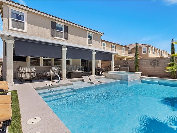 Welcome home in the vibrant Inspirada community. This exquisite 5-bedroom, 5-bath residence is highlighted by a massive sparkling pool/spa. As you step inside, the glamorous porcelain tile flooring immediately sets a tone of finesse. The kitchen is a chef’s delight, boasting updated cabinetry and top-of-the-line appliances, making it both stylish and functional. Open living/dining area is bright and airy. Bedroom and full bathroom on main floor The grandeur continues upstairs; loft space, massive owner's suite that promises a serene retreat. Primary bathroom features a custom vanity and closet. Additional 3 bedrooms, ensures comfort and style for family and guests alike. Step outside to the covered patio, where remote-powered shades create the perfect ambience for dining al fresco. The cool decking is a treat. Whether it's unwinding in the privacy of your backyard oasis or entertaining guests in style, this highly upgraded home is for those who seek comfort and sophistication.