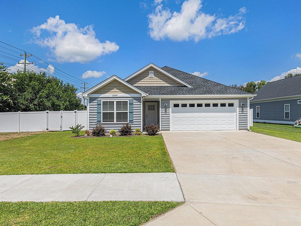 Welcome to 2599 Woodcreek Ln., a beautifully crafted 3-bedroom, 2-bath home located just minutes from the charm and convenience of historic downtown Conway, SC. Built in 2024, this single-story home blends thoughtful design with modern comfort. The primary suite features tray ceilings, a walk-in closet, and a luxurious bathroom with dual sinks, a garden tub, and a separate shower. The open-concept layout boasts vaulted ceilings in the family room and a neutral color palette throughout, creating a light and airy feel. The kitchen is equipped with stainless steel appliances, solid granite surface counters, a breakfast bar, and a pantry. Additional highlights include an entrance foyer, walk-in closets, central heating and cooling, and a fully fenced backyard—perfect for entertaining or relaxing. With no HOA fees and a builder’s warranty still in place, this move-in-ready home offers peace of mind, ample space, and unbeatable value.