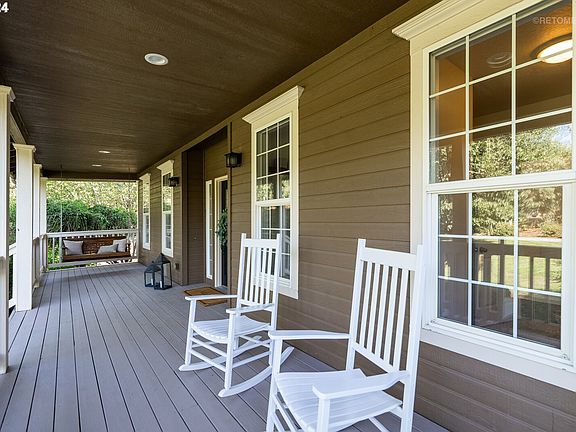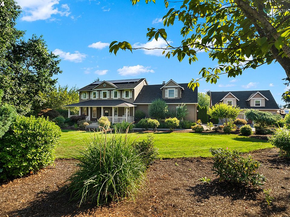 This gorgeous close-in home on gentle-sloping acreage offers incredible potential for two separate living quarters with partial views of Mt. Hood. The freshly renovated main home showcases a beautiful floorplan including hardwood oak floors and high ceilings on the main level, granite & quartz kitchen countertops, formal dining room, breakfast nook with built-in bench seating, separate living room and family room with wood stove, laundry room with sink, & powder room. Upstairs are four spacious bedrooms including a primary suite with wall-to-wall carpet & LVP flooring, double vanity with quartz countertops, modern soaker tub, walk-in closet, & vaulted ceilings. Rounding out the upper level is a huge bonus room & double vanity bathroom. The lower level of the home functions as separate living quarters, is accessible from both the interior & exterior of the home, and features a full kitchen with quartz countertops, built-in microwave, dishwasher, full-size range, living room, eating area, two bedrooms, & a full bathroom. It is heated & cooled by a mini-split system but could be reconnected to the main house, has a washer & dryer hookup, and is equipped with added soundproof insulation between the main floor & basement. The second living quarters is located on the upper level of the detached garage & includes two large bedrooms & a full bathroom. Part of the detached garage has been converted to an office space with LVP flooring & a sliding door that looks out over the backyard, mature fruit trees & surrounding views. Between the attached 3 car garage and 2 car detached garage, you'll have ample room for all your toys & RV's & includes a 30amp electrical hookup. The gentle-sloping backyard offers stunning territorial views from the hot tub & new deck. Nestled within 8-10 miles from Newberg, Sherwood, Beaverton, & Hillsboro offers the perfect proximity to several popular destinations including Ponzi & Raptor Ridge Vineyards,South Store Cafe, Smith's Berry Barn & more!