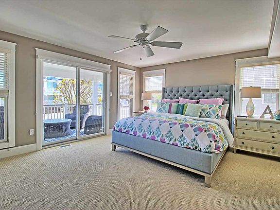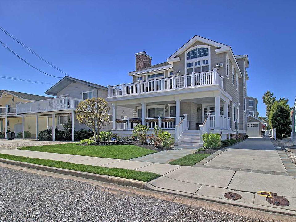 BEACHBLOCK. OCEAN VIEWS. CENTER OF TOWN. ALMOST NEW! Pristine, 3 story, beachblock , upside down style home masterfully built by one of the island's top builders, Brandywine Developers. The exceptional curb appeal is enhanced by beautiful landscaping and a welcoming covered porch. The glass panel front door invites you into a sun filled wide foyer. All common areas have white oak floors and the first floor is accented with wainscoting. The first floor junior master is an expansive room with custom tiled ensuite bath and immediate access to the covered front porch. A second bedroom known as "the bunk room" is great for the kids and adjacent to a custom tiled hall bath . A brand new bedroom was recently built and beautifuuly furnished. The family room faces south, has built in cabinets, fridge and overlooks the built in, heated pool with sunshelf, mature landscaping, stunning brick water feature and ample room for lounging as you watch the ball game on the exterior flat panel tv. The double wide oak stairs lead to a sensational great room with planked ceiling, white oak floors, kitchen with custom beaded inset cabinets, stone counter tops, expansive center island and a large pantry. The appliances include a Wolf range, Subzero refrigerator, Asko dishwasher and a microwave drawer. All windows have clear story glass; the fireplace is gas fed with limestone surround and custom mantle; the wet bar has matching cabinets and limestone top. The great room accesses a large sundeck with ocean views, automated awning and outdoor speakers. A powder room services the great room. The two large bedrooms on the second floor have custom tiled ensuite baths. The wide staircase leads to a balcony overlooking the great room and to the expansive master suite with sitting area, large walk in closets, second laundry and a gorgeous stone master bath with twin sinks and a sensational shower with multiple shower heads and sprays. A spacious, private deck off the master overlooks the pool, gardens and reveals a wonderful sunset. Special features include multi zoned gas heat and central air; two gas hot water heaters; distributed audio throughout; exceptional trim package; composite decking and vinyl railings; outside shower, detached storage/cabana and off street parking for a minimum of three cars. Recent improvements include fresh paint throughout, new stone center island top, lighting fixtures, new furnishings and Sonos sound system. The home is sold tastefully furnished. Seller holds a New Jersey Real Estate License.
