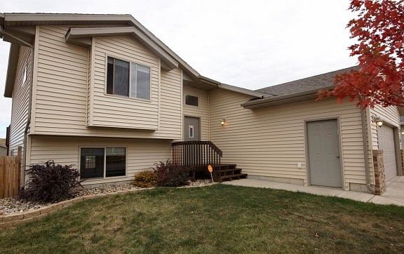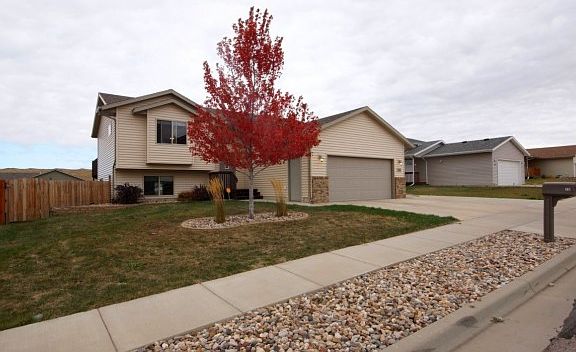 Delightful split foyer home that is clean-lined and welcoming. The upper level offers an airy open feel and features vaulted ceilings, functional kitchen with breakfast bar, dining room with access to deck and a sun-kissed living room featuring window with bench seat. Down the hall is the Master bedroom that provides private master bath, large walk-in closet and trayed ceiling; an additional bedroom and full bath complete this floor. The lower level includes a spacious family room with walk-out access to the backyard, 2 bedrooms, bathroom and laundry/utility room. This home creates a very comfortable living space with all the natural light, beautiful flooring, stylish finishes, and great floor plan. The backyard offers wonderful outdoor living with a large privacy fenced yard and deck. Additional amenities include extra concrete parking pad next to garage, storage space above garage, and beautiful landscaping. Vivint Alarm system stays with home; buyer can choose to sign contract. Under 20 minutes from Ellsworth AFB and minutes from shopping and restaurants! Call for your showing today!