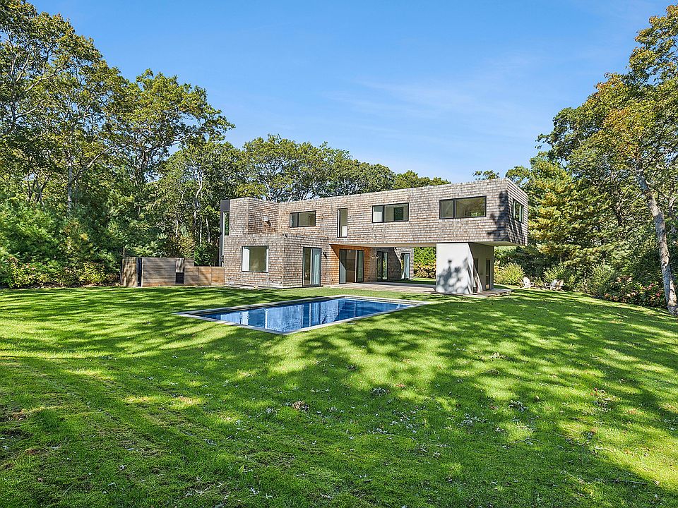 Experience the ultimate in sustainable luxury in this nearly new 4,250 +/- sq. ft. residence on nearly 1.5 acres of very private, lushly landscaped property. A striking blend of glass, cedar, and stucco; the home is approached by a stone driveway framed by mature plantings, offering a grand yet welcoming arrival. Inside, a custom floating steel staircase anchors the entry, leading to an open, light-filled floor plan enhanced by 10' ceilings, expansive sliding glass doors, and a southern orientation that maximizes natural light. The living room, with its sleek gas fireplace, flows seamlessly into the generous dining area—ideal for intimate dinners or stylish entertaining.Just beyond, a large covered mahogany deck creates a true indoor/outdoor experience, complete with a chic al fresco dining area, outdoor TV, bar, and a spacious lounge centered around a dramatic gas fireplace. The state-of-the-art kitchen features custom cabinetry, low-maintenance Silestone counters, a breakfast bar, and premium appliances by Liebherr, Bertazzoni, and Viking. A first-floor junior primary suite—also perfect as a den—includes an en-suite bath, along with a guest powder room. Upstairs, the private primary suite occupies its own wing, offering two walk-in closets and a spa-like bath. Two additional en-suite bedrooms and a full laundry room complete the level.The impressive lower level, with 9' ceilings, offers a large multi-use great room—perfect for a media area, bar, or gaming space—plus a secluded fifth bedroom and full bath ideal for guests or staff. The fenced, resort-style grounds include expansive lawns, vibrant landscaping, a fire pit, a chic outdoor shower, and a stunning 16' x 32' saltwater gunite pool. A detached two-car garage completes the offering. Located minutes from Sammy's Beach, Three Mile Harbor, and a quick drive to East Hampton and Sag Harbor villages, the home offers easy access to world-class dining, shopping, and water activities. As a bonus, this property is designed as a Net Zero home, integrating geothermal heating, solar energy, high-efficiency systems, and passive solar design to dramatically reduce operating costs.