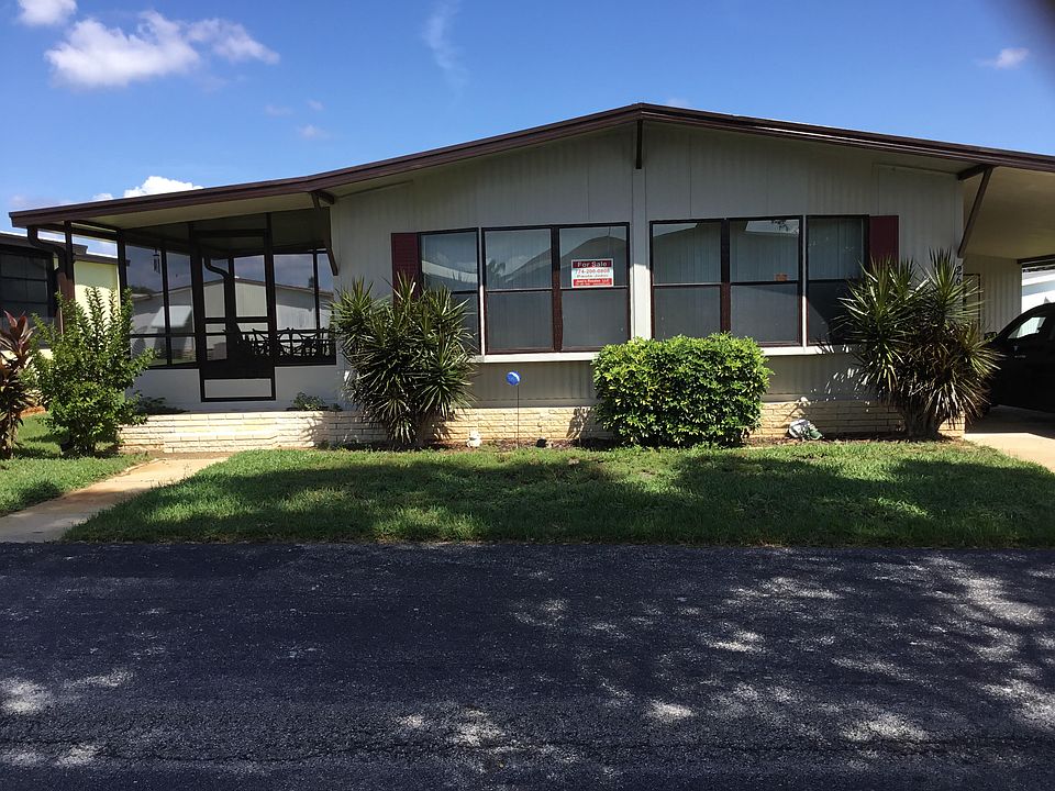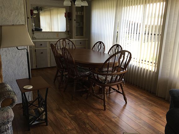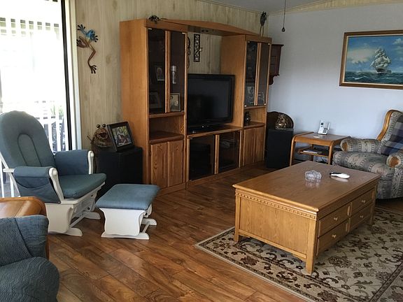 26 Alpine Dr. Lovely double wide in retirement park with two swimming pools,active clubhouse,schuffelboard,horseshoes etc. Two car driveway with carport plus shed for storage and laundry area Screened lanai with tile top table to enjoy your morning coffee Home is fully furnished to move right in and start enjoying the Florida life Gallery kitchen with plenty of cabinets plus a small built in breakfast or lunch table area Plus a dining area off the kitchen with a built in hutch and large dining table with four large windows to let light in (very cheerful) Good size living area fully furnished with tv Beautiful wood floors through living and dining area Tile floors in kitchen and two bathrooms Mstr. Bath has tub/ shower Guest bath has step in shower Both bedrooms have walk in closets House recently painted on outside Well maintained on inside Lot rent $423 month includes trash pickup Size 24x43. 1032 sq ft
