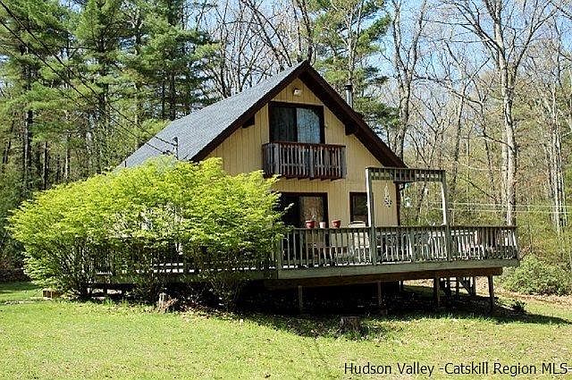 Country living in this Adorable Chalet style home. Perfect weekender home or year round living. Set back off the road and has a very peaceful setting. This home has an open floorplan for the Living Room, Kitchen & Dining area. First level has Full bath, 1 bedroom and a den with Laundry hook up in it or can be the 4th bedroom. The 2nd level offers 2 Bedrooms , full bath and an exterior balcony If you enjoy wildlife or outdoor activities this is the perfect home for you. The property is lined with Mountain Laurel . Also included is a large shed that has Electric and a generator hookup. The roof and gutters were updated in 2014. Sq ft as per recent appraisal in Feb 2016