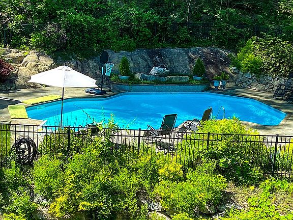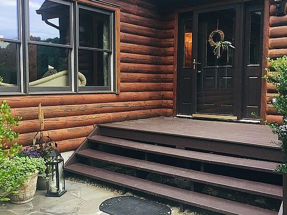 Rustic log home on quiet culdesac set on stunning, private 8+ acre property with in-ground pool and sport court allowing for plenty of outdoor activities and lots of privacy. This energy efficient home showcases an inviting front porch and cantilever balcony that takes in the extraordinary property views. The warm knotty pine interior boasts tasteful and distinctive design elements as well as quality craftsmanship in the details of the home. Open sight lines show off the huge beams and trusses and makes entertaining effortless. Mission style kitchen cabinets/tumbled marble floors/granite countertops/SS appliances. Family room w/stone fireplace and HW floors throughout. CAC-new in 2020. Master bedroom with vaulted ceiling and marble fireplace. Updated Master bath on-suite with Carrara marble, oversized shower and tub. Large finished playroom and unfinished workroom with plenty of storage. Beautifully landscaped property w/ natural surroundings. Located just over the Westchester border