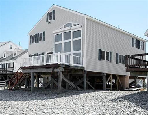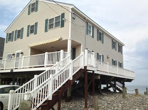 Waterfront!! Spectacular light filled home situated directly on Humarock Beach offers coastal living at its best as the open floor plan is accentuated by floor to ceiling walls of glass offering amazing unobstructed views of the ever changing blue ocean. Ideal for entertaining, the wraparound mahogonay deck withs stairs to beach on ocean side also offers scenic views of nearby South River & boats on the opposite side of the home. This lovely 4-5 BR contemporary with beautiful new 2013 kitchen, newer baths & hardwood throughout offers every amenity plus potential for 3rd flloor expansion with full attic space. The flexible floor plan includes 2nd floor lofted family room offering panoramic views of the Atlantic & space for guests while the 1st floor bedrooms may be used as office & den space as needed. Great storage throughout including partly finished full attic with windows & skylight. Easy beach living includes exterior shower, lighting & additional storage...