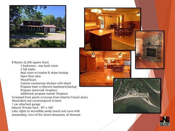 Motivated seller looking for serious buyer for property located at 26 AuSable Beach Road, Peru, NY. Two story 3 bedroom/2bath 1960 home featuring a 1 car attached garage with waterfront access to Lake Champlain. Completely remodeled four season home on private access road with deeded lake rights to incredible sandy beach and cove with outstanding view of Vermont. Wood floors with open floor plan. Kitchen features island kitchen with custom countertops. Family room has beautiful stone propane fireplace, and sun room features a propane mantel fireplace. House has a mudroom with water/dryer and storage. Upgraded on demand propane hot water, propane monitor heater with electric backup. Screened front porch and natural private lot. Rear deck and covered area to complete a quiet, comfortable, relaxing home. Attached one car garage has new metal roof. All rewired and new plumbing through house with an eye on flair/design and function for families. Three bedrooms located on second floor with full bathrooms on both levels. Asking $229,000 – no rent to own or land contracts