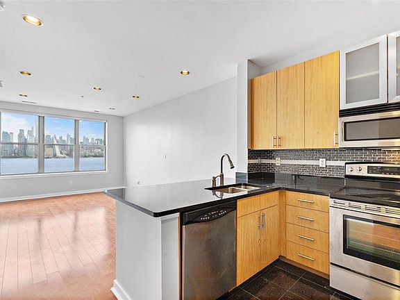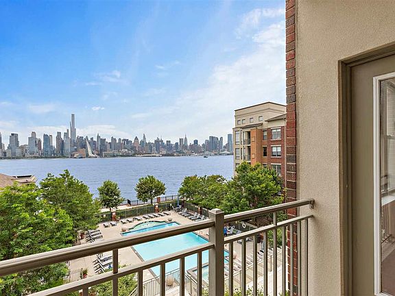 Upon entering into this spacious 760+sqft 1 bed/ 1 bath condo you are greeted with an expansive view of the iconic NYC skyline. This updated kitchen features cherry wood stain cabinetry, stainless appliances, granite counters, and a breakfast bar. The nicely sized master bedroom features a walk in closet and a jack and jill en-suite. Additional features of this lovely home are gleaming hardwood floors throughout, ample closet space, intercom, washer/ dryer, dish washer/ dryer and a balcony overlooking the Hudson River. The building is conveniently situated near the Light Rail, buses to NYC, the ferry, restaurants, major chain grocery stores, as well as a children's park across the street. Amenities include a 1 car parking space, pool, gym, tennis court, community room, and building security.