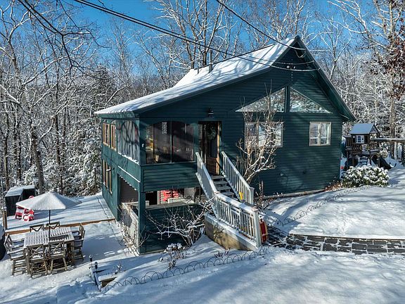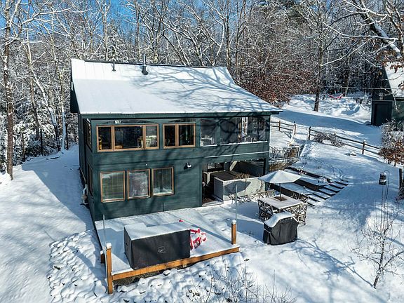 Begin your journey by crossing a classic covered bridge and traveling along a quiet country road, leading you to this secluded hilltop retreat. Nestled on 37 acres of pristine woodlands with trails, the property offers a striking combination of natural beauty and privacy. The residence seamlessly blends contemporary design with country charm. A welcoming screened porch opens into a spacious, open-concept living, dining, and kitchen area that is filled with natural light, thanks to an abundance of windows showcasing scenic, ever-changing views. Inside, the home is further elevated by high ceilings, updated kitchen, custom mahogany doors and spacious bathroom with a soaking tub. The lower level features a generously sized master bedroom, complete with office space and direct access to a captivating hot tub and patio area. Additional amenities include a full bath with laundry, a cozy bedroom, and a utility room. The spacious, heated, two-car garage offers ample work area and storage space on the second floor. The property enjoys a convenient location within easy reach of Putney, Walpole, Keene, and Interstate 91, making it an ideal retreat with accessibility to nearby towns.