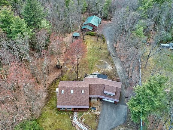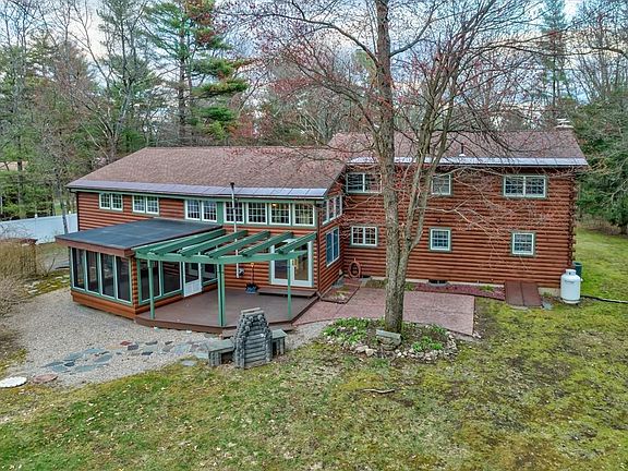TRANQUILITY AND PRIVACY AWAIT YOU WITH THIS BEAUTIFUL LOG HOME LOCATED ON 3.55 PRIVATE ACRES! Inside are three bedrooms and two full baths, a wonderful open floor plan includes a huge kitchen and dining room with granite counters, stainless steel appliances to include a double wall oven. View the majestic cathedral ceilings with exposed beams throughout with a gorgeous stone fireplace in the living room, and a massive great room with a wonderful open loft for private contemplation. This house boasts C/A, multiple decks, an enclosed porch and a fabulous yard. If you are looking for outdoor storage for toys or a workshop, besides the attached two car garage, check the massive detached garage which is 65'x36x13! It is fully insulated, heated with a wood stove, metal roof, exhaust fan, interior clear span ceiling height of 13.5', 12x16 doors, concrete floor, water and 220 amps! This property truly has it all and is a must see! Easy commute to Springfield and Northampton!!