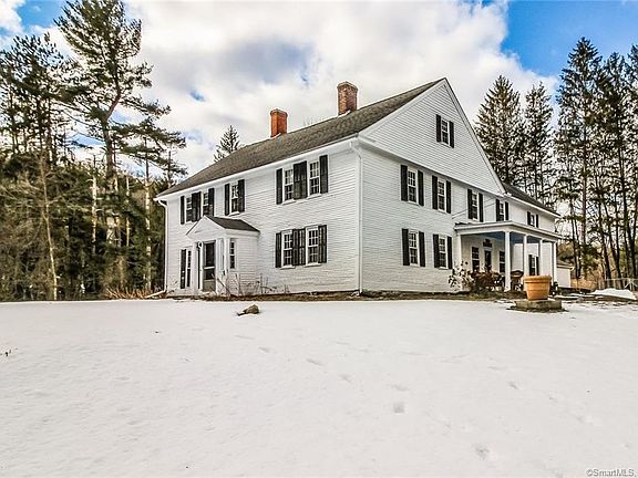 On a quiet Brooklyn road, this ca 1704 home boasts loads of frontage on Blackwell's Brook known to be stocked with trout, thus providing your own private fishing hole Wildlife abounds on this 21-acre property which features a back pasture perfect for letting out horses or other farm animals. The 4074 square foot home has 5 bedrooms and 2-1/2 baths with a custom cherry kitchen with Corian countertops, an adjoining dining room with fireplace and a front parlor also with fireplace all with wood floors. There is a lean-to for storing your tractor and another outbuilding with a basement that would be great for sheep or goats as well as a garage attached to the house. Updates over the years include the furnace, windows and insulation. Gardens with mature plantings like blueberries and hops - just in case you are thinking of taking up making beer Plus lots of frontage on State of CT trout-stocked Blackwells Brook for your on private angling spot