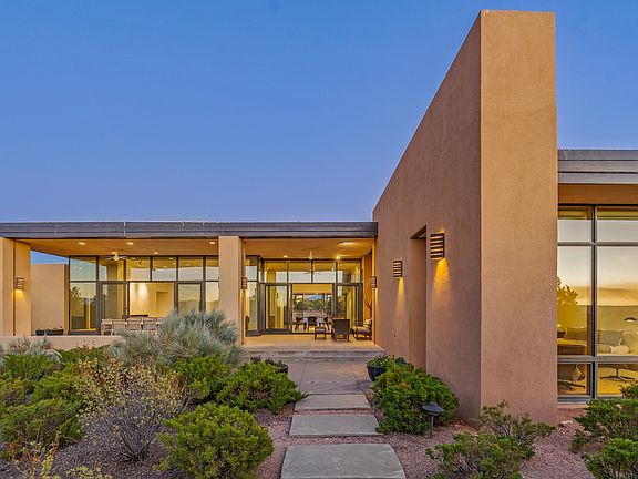 Striking modern architecture in Las Campanas! 26 Bishop’s Dome was designed by Craig Hoopes and built by Chuck Apple to capture light, views, and refined Santa Fe living. The home offers 5 bedrooms and 7 bathrooms, including two powder rooms, with a thoughtfully designed floor plan featuring two living rooms and two portals, ideal for both elegant entertaining and relaxed daily living. Walls of glass frame extraordinary east-facing views of the snow-capped Sangre de Cristo Mountains and west-facing Jemez Mountain vistas, delivering exquisite sunset views. The portals extend the living spaces outdoors, creating seamless indoor–outdoor living for gatherings or quiet enjoyment of the surrounding landscape.