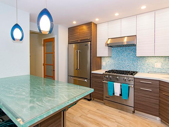 MANHATTEN ON THE BEACH Ocean Block Condo completely redone in 2014 with top of the line everything!! Floors are wood look tile throughout. Windows are double pane with privacy and solar coating. The kitchen has custom cabinets and a glass island with lights controlled by remote, Viking appliances, custom concrete counter top with molded sink, built in window seat to name some of the upgrades. Both bathrooms are floor to ceiling glass tile with glass counter tops and spa details. Stairs were replaced and there is custom railing. Upstairs the master has a deck for your evening glass of wine or morning coffee. Custom doors and a full basement with extra insulation for warmth...This is a MUST SEE UNIT to appreciate the detail and love that was put in the remodeling.