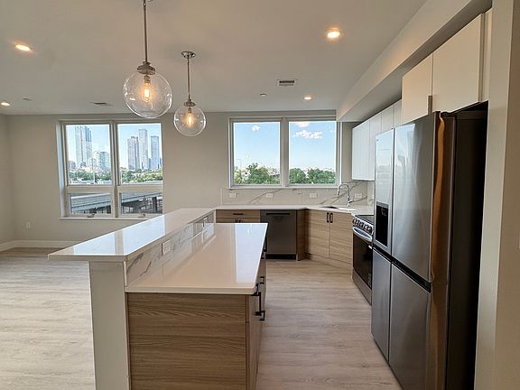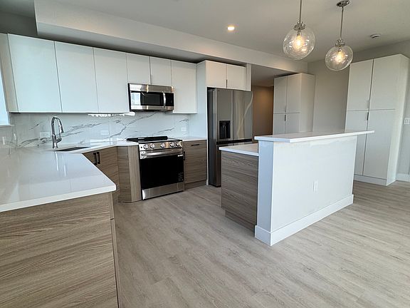 The L-shaped kitchen features an island with a window, two full height pantries, stainless steel appliances, two-tone cabinetry, and white quartz countertops. The open layout provides ample room for a dining area and a generous living room. There is a nice entry hallway with a double door closet. The corner layout offers ample light! Additional highlights include two full bathrooms, one with a dark feature tile, in-unit washer/dryer, and overhead lighting throughout.