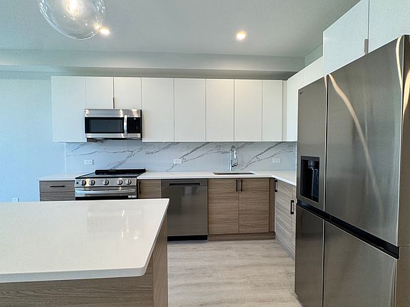 Modern designL-shaped kitchenPremium finishesTwo-tone cabinetryStainless steel appliancesOpen layoutWhite quartz countertops